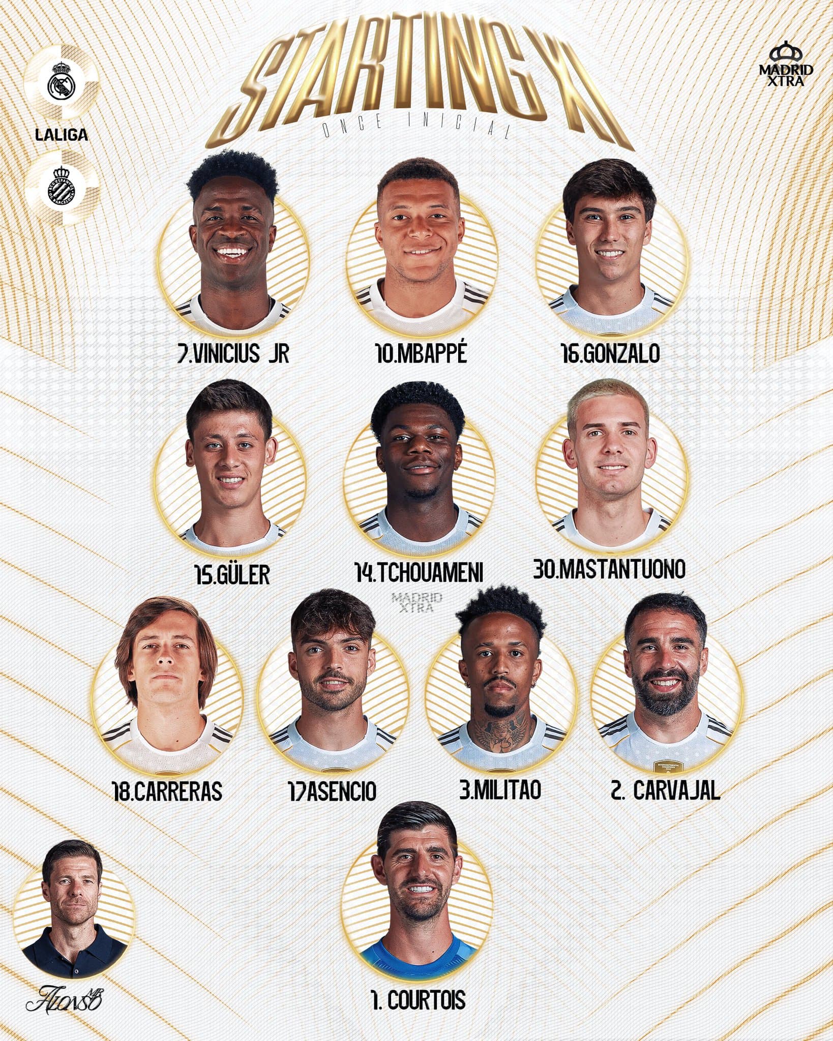 ריאל מדריד – הרכב משוער: טיבו קורטואה| דני קרבחאל, ראול אסנסיו, אדר מיליטאו, אלבארו קארראס (פראן גארסיה)| אורליאן טשואמני, פדה ואלוורדה, ארדה גולר| פרנקו מסטאנטואונו, ויניסיוס ג’וניור וקיליאן אמבפה