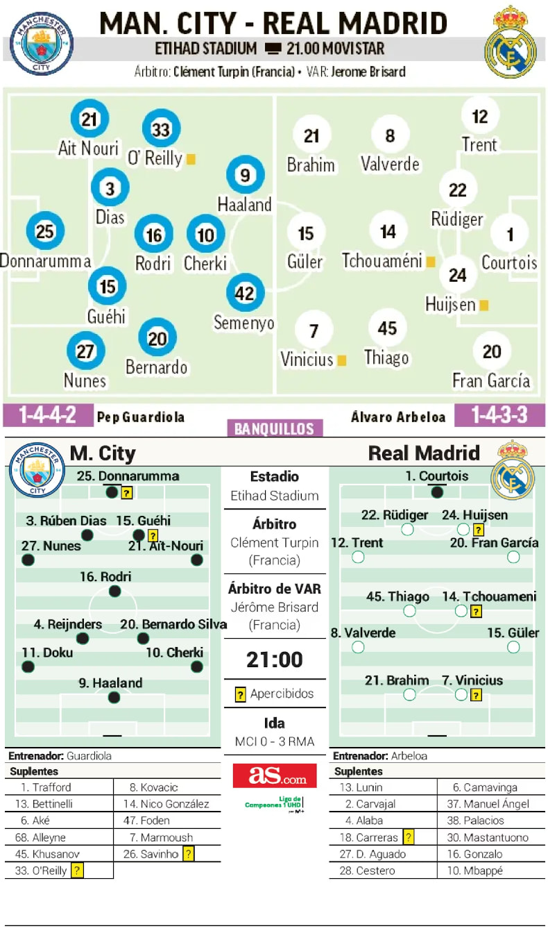 על פניו נראה שריאל מדריד תשמור על רוב ההרכב מהמשחק בברנבאו. מה שהיא חייבת לשמר זה עניין הריצה (ואולי זה היתרון בכך שאמבפה יסופסל), כשבמשחק הראשון ריאל רצה יותר מהיריבה לראשונה מזה זמן רב בליגת האלופות. אותו הרכב כמעט זה אומר טיאגו פיטראץ’ ב-11 שוב במקומו של אדוארדו קמאבינגה (“הצעירים הרוויחו את הדקות שלהם, האקדמייה מציגה רמה גבוהה מאוד”), זה אומר שארדה גולר חוזר להרכב (פתח על הספסל נגד אלצ’ה ושבר בצורת עם שער ענק), זה אומר בלי חלוץ חוד אמיתי. לגבי עמדת המגן השמאלי יש אפשרות להפתעה: אלבארו קארראס כנראה החלים מהפציעה קצת מוקדם יותר, הוא בסגל ואולי הוא יחליף את פרלאן מנדי הפצוע ולא פראן גארסיה ששיחק בליגה. אם פראן ישחק זה יהיה אולי האתגר הגדול ביותר שלו לצד גמר הגביע נגד ברצלונה בשנה שעברה. פראן מהיר כמו שד, נלחם, ומצד שני לוקה בחסר הגנתית. ראול אסנסיו ממש כשיר ובלי קשר דין האוסן מועדף על פניו. טיבו קורטואה שרשם הצלה ענקית במשחק הקודם, זו עם הרגל – מעולם לא שמר על שער נקי מול סיטי באיתיחאד ויש לו אתגר גדול.