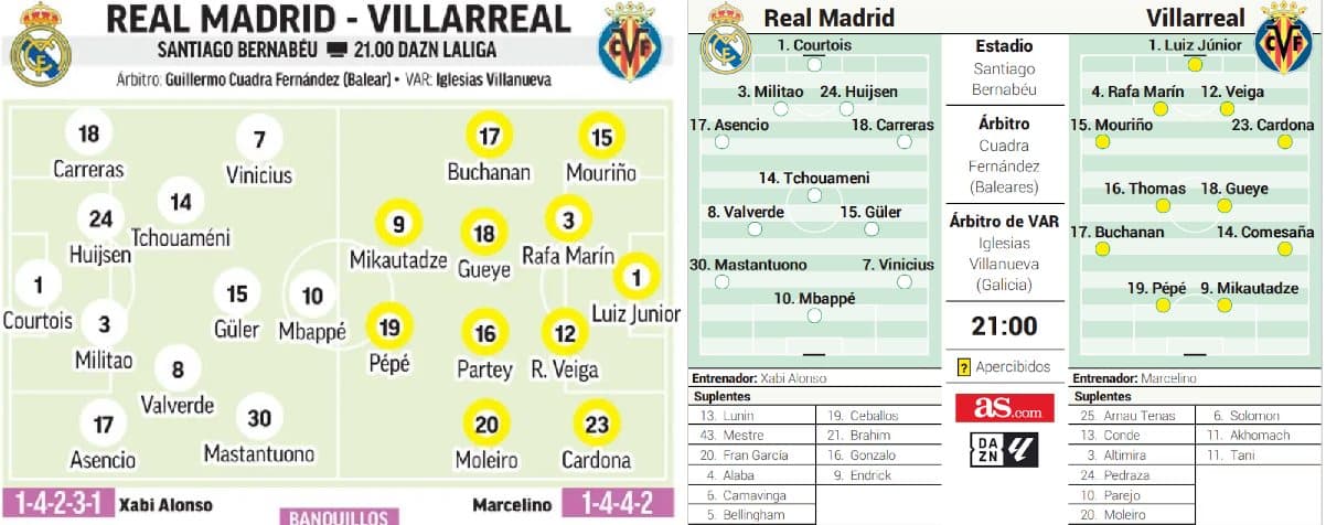 אם ויאריאל תנצח בברנבאו, מה שהמאמן שלה עשה רק פעם אחת לפני כמעט 20 שנה (ב-2006-07 עם רקראטיבו) – הצוללת יכולה להעפיל זמנית לפסגה. מרסליניו לא מתעסק בכך: “זה יכול להיות נחמד אבל בעיקר זמני. אנחנו מרוצים מפתיחת העונה. ריאל מגיעה אחרי תבוסה כואבת מה שהופך אותה למסוכנת יותר. אם נפתח את המשחק חזק זה עלול לפגוע בהם, אבל יש להם כל כך הרבה משאבים כדי לחזור. זו גם קבוצה שונה מאשתקד, כזו שלוחצת בחצי המגרש של היריבה”. הוא מדבר על הרצון לאלץ את ריאל להגן קרוב לשער שלה ומבטיח: “לצד מאמץ מקסימלי וקושי, בטוח שתהיה התלהבות. עלינו למזער נזקים בהגנה ולהגן לא רק אישית אלא גם קולקטיבית”. על אמבפה: “אנחנו יודעים עד כמה הוא החלטי, מדויק, מהיר, הוא מוכיח את זה כל העונה. אבל לא נתכונן בצורה מיוחדת, יש להם עוד שחקנים טובים כל כך”.
