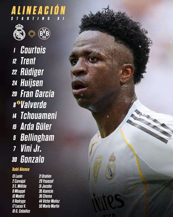 ריאל מדריד – הרכב משוער: טיבו קורטואה| טרנט אלכסנדר-ארנולד, אנטוניו רודיגר, דין האוסן, פראן גארסיה| אורליאן טשואמני, פדה ואלוורדה, ארדה גולר, ג’וד בלינגהאם| ויניסיוס ג’וניור וגונסאלו גארסיה
