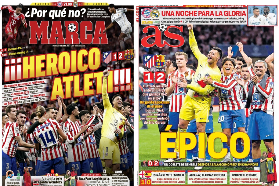 כותרות העיתונים הבוקר במדריד - מתרכזות בעיקר בהעפלה של אתלטיקו מדריד לחצי הגמר, על ריאל מדריד בקטנה למעלה: