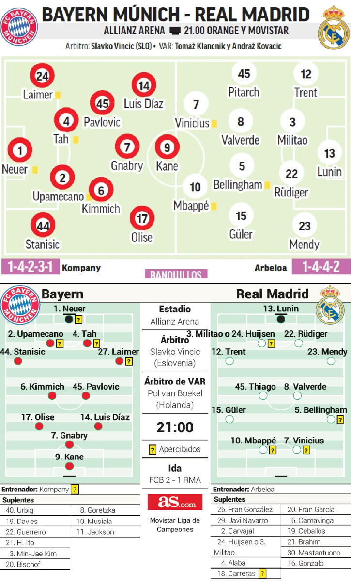 המארקה וה-AS עם הסכמה ברורה על כך שפרלאן מנדי יפתח כמגן שמאלי וגם על הקישור: כמובן עם ג’וד בלינגהאם ופדה ואלוורדה, וגם עם טיאגו פיטארץ’ וארדה גולר, כלומר ללא אדוארדו קמאבינגה. ויניסיוס ג’וניור וקיליאן אמבפה בהתקפה. מחלוקת אחת – במרכז ההגנה. המארקה עם אדר מיליטאו בעוד ב-AS השאירו פתח לכך שדין האוסן יפתח לצד אנטוניו רודיגר.