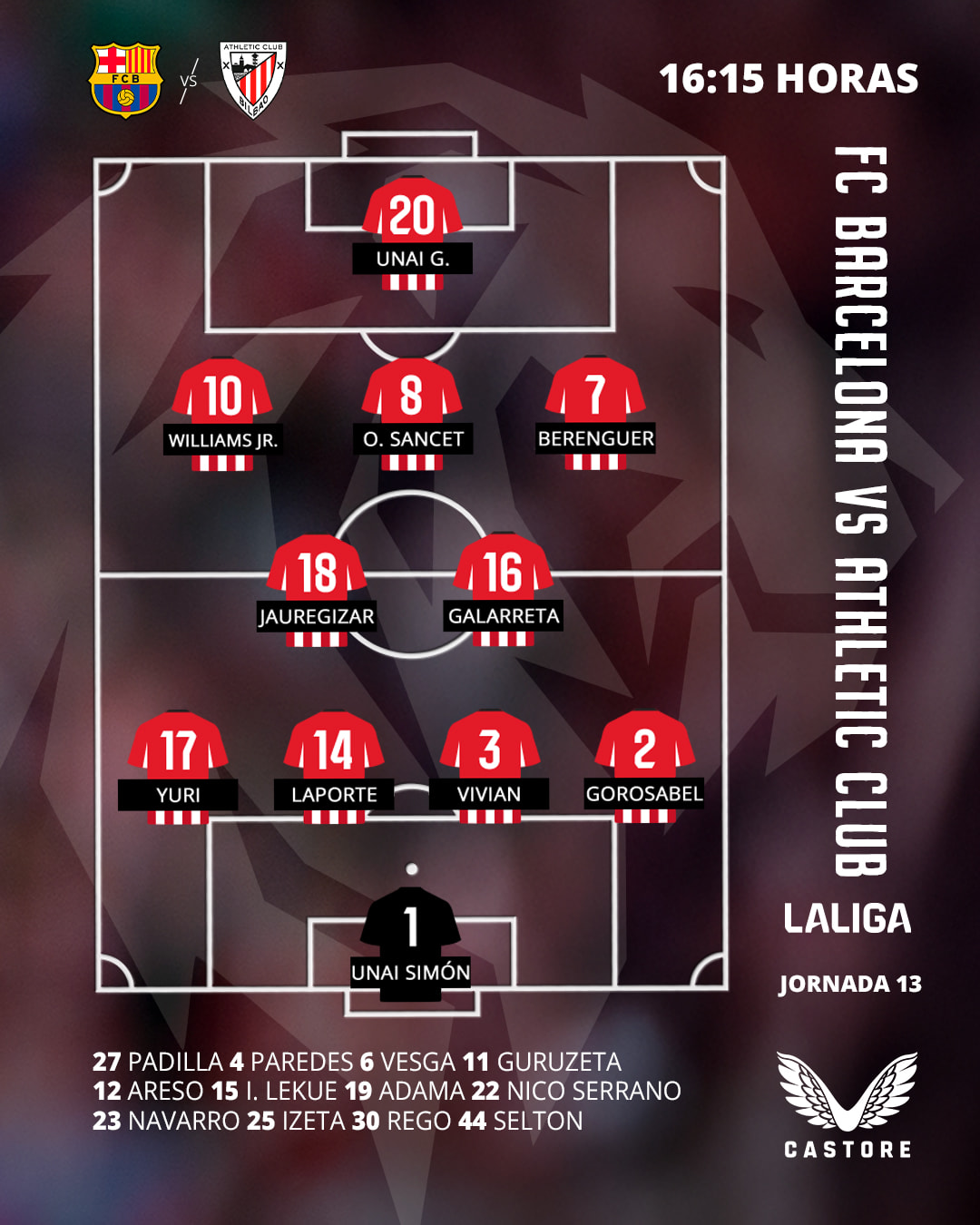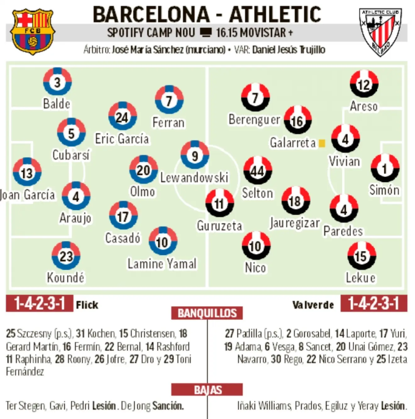 אצל הבאסקים האנטישמים ייעדר אינייאקי וויליאמס, שלא נעדר מאף משחק של בילבאו כבר 28 שנים חוץ מאשר במשחקים שהוא נעדר מהם. אחיו הילד הניג’ס ינסה להוביל את ואלוורדה וחניכיו לניצחון שני רצוף לראשונה מאז אוגוסט, ובמעלה הטבלה (כרגע הם במקום ה-7, עם מאזן של 5 נצחונות, 5 הפסדים, 2 תוצאות תיקו, ויחס שערים של 12:13). כל זה לפני שהמקום הרביעי, שהיה רשום על שמם בטאבו, בורח.