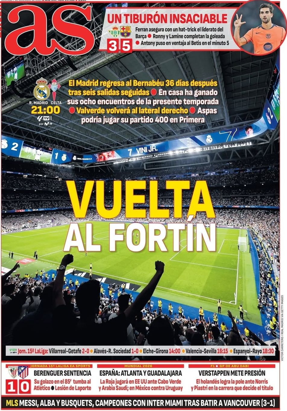 בהתקפה מחכה ריאל לשערים של שחקנים אחרים חוץ מקיליאן אמבפה שרשם צמד אדיר נגד בילבאו. השער הבא שלו – נקווה שמחר – יהיה מספר 70 בריאל מדריד. בשנת 2025 יש לו כבר 55 שערים במועדון והוא ‘רודף’ אחרי השיאים של כריסטיאנו רונאלדו. אין זה פלא שאלונסו נשאל על אמבפה ועל רונאלדו וענה בקלישאות. “שניהם יוצאי דופן, שחקנים היסטוריים, ריאל מדריד ברת מזל שהם חלק ממנה. כריסטיאנו הוא כריסטיאנו וקיליאן הוא קיליאן. אני חושב שקיליאן בדרך לעשות היסטוריה בריאל. הוא עובד נפלא ביום-יום. הוא עם אותה אמביציה כמו כריסטיאנו ונמצא ברגל גדול”. בחזרה לסאן ממס – גם ויניסיוס ג’וניור הגיע למצבים אבל החמיץ אותם, משחק מצוין בלי הדבר כמעט הכי חשוב – להבקיע. הספירה שלו עומד על 11 משחקים ללא שער. אלונסו נשאל על השיחה ביניהם ומה השתנה: “הוא במקום טוב אישית ומקצועית, הוא היה מצוין. הוא נותן לקבוצה הרבה אנרגיה ומהווה סיכון ליריבה, אנחנו שמחים שהוא במצב רוח כזה”. ובכל-זאת, זוכרים את המסר של ויני אחרי בילבאו? “השערים יבואו”. אנחנו מחכים וגם עוד 80 אלף האוהדים..