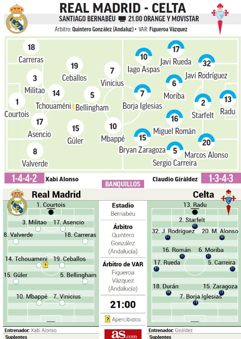 ריאל מדריד – הרכב משוער: טיבו קורטואה| פדה ואלוורדה, אדר מיליטאו, ראול אסנסיו, אלבארו קארראס| אורליאן טשואמני, אדוארדו קמאבינגה, ארדה גולר, ג’וד בלינגהאם| ויניסיוס ג’וניור וקיליאן אמבפה
