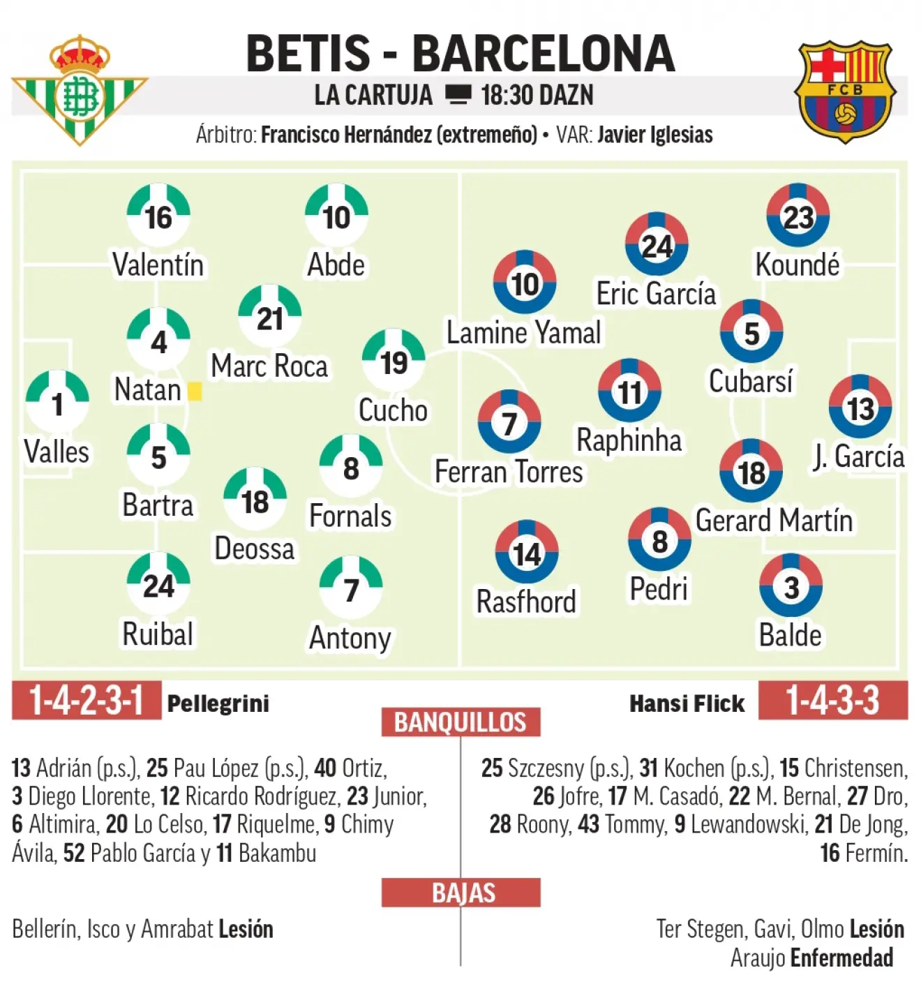 בגזרת ההגנה, מעניין אם פליק ימשיך לפתוח עם אריק בעמדת ה"איפה נציב אותך היום?", או שייתן לו מנוחה סוף סוף (היחיד בברצלונה ששיחק בכל המשחקים העונה), בעקבות חזרתו של פרנקי לסגל אחרי עוד היעדרות אקראית. שאלות נוספות שעולה לקראת המשחק היום, במיוחד לאור המשך היעדרותו של אראוחו, הן “כמה מרטין נעץ את עצמו בהרכב?” ו-“כמה כריסטנסן מחוק סופית אצל פליק?”.