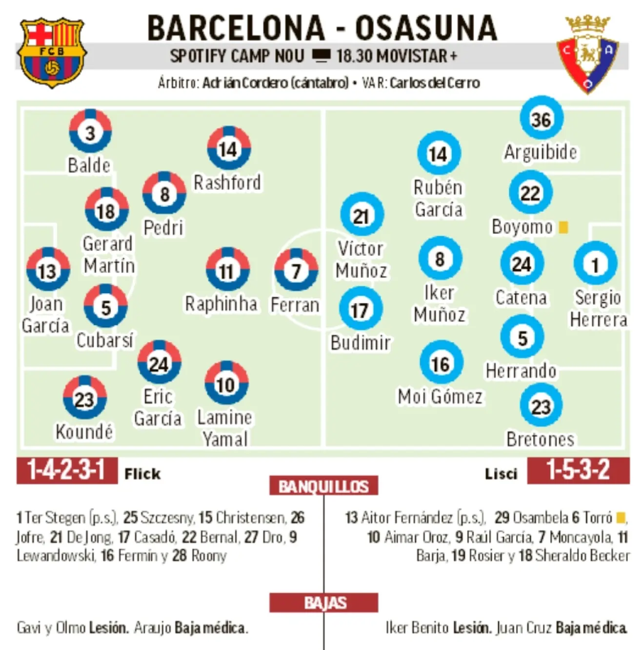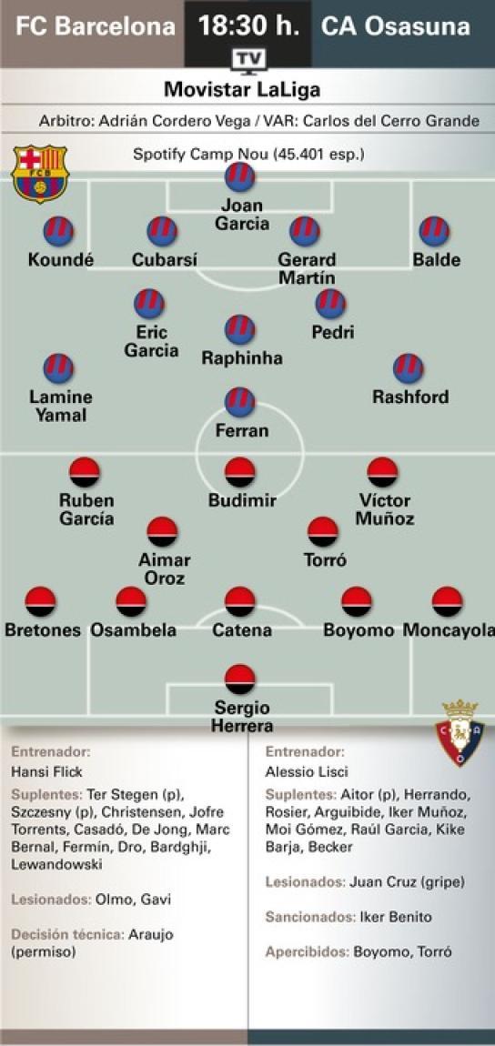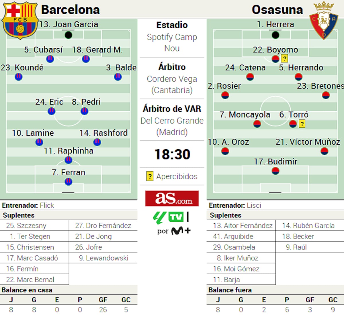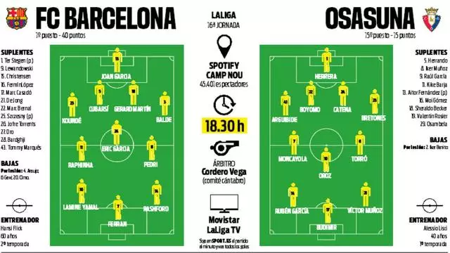 בעקבות כך, ובעקבות היותה במקום ה-15 (14 נקודות מ-15 משחקים, 4 נצחונות, 3 תיקו, 8 הפסדים, מאזן שערים של 14:18), אוסאסונה תעלה הערב למשחק עם סכין בין השיניים ובודימיר בין קו ההגנה הברסאי לדון ז’ואן גרסיה, כדי לגרד משהו מהדשא בקאמפ-נואו (ואולי גם למכור אותו תמורת כמה שקלים. זה עובד ללאפורטה). הבעיה הגדולה עבור הקבוצה מפמפלונה? היא מחזיקה במאזן החוץ הגרוע בלה-ליגה - 6 הפסדים, 2 תוצאות תיקו, 0 עגול של נצחונות, עם מאזן שערים של 3:10. לא שזה אומר משהו נגד הגנת האימים הברסאית.