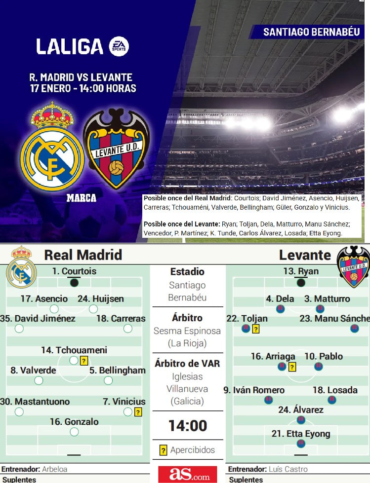 אלה שייעדרו הם אנטוניו רודיגר שהיה צפוי אחרי רצף משחקים מטורף – שלא יחזיק מעמד, טרנט אלכסנדר-ארנולד לא מתאמן, גם פרלאן מנדי ואנדריי לונין. ראול אסנסיו ספג מכה חזקה נגד אלבסטה ומתאמן עם מסכה, הוא ימשיך לצד דין האוסן. אלה שיחזרו להרכב הם טיבו קורטואה כמובן וגם אורליאן טשואמני וג’וד בלינגהאם (“הוא התאמן תחתיי מעט אך ברור שהוא צריך להיות אחד המנהיגים של הקבוצה”), אלבארו קארראס, כאשר ארבלואה הבהיר שהשחקנים שלא היו בסגל – היו זקוקים למנוחה ודרגת סיכון לפציעה. מי שכן היה נגד אלבסטה אך לא הורגש היה פדה ואלוורדה וזה על אף ששיחק בקישור כמו שחיכה. “פדה חסר את הניצוץ”, נכתב עליו ב-AS, וזה מצטרף לדיווחים על המשבר מול המאמן היוצא. מחר יערוך פדה, הקפטן השני של המועדון, את הופעתו ה-350 בלבן וזה ציון דרך גדול שהיה צריך לקרות באווירה יותר משמחת. ארבלואה החמיא לפדה ואמר שהוא היה יכול להיות טוב גם בשער והשווה אותו לחואניטו הנפלא ז"ל. “הוא קפטן פנטסטי וישחק בכל מקום אליו ידרש. מבחינתי ואלוורדה הוא מה ששחקן של ריאל מדריד צריך להיות”.