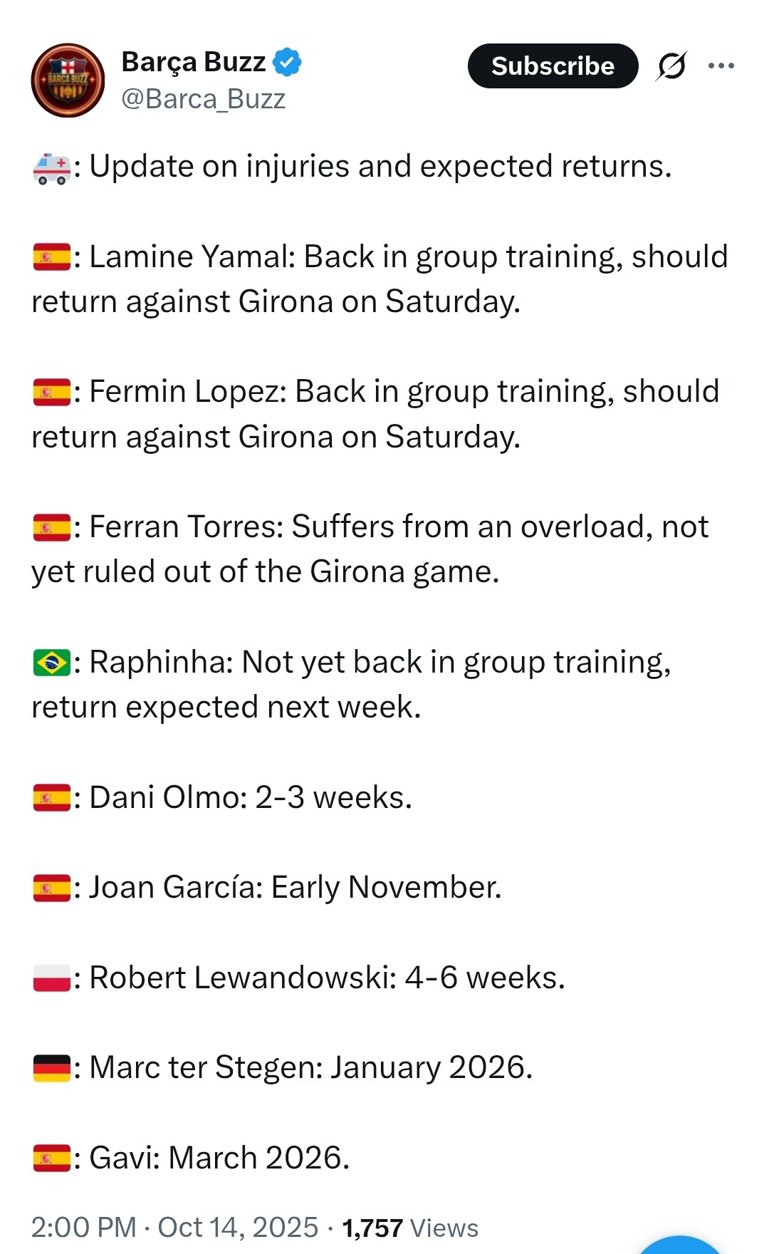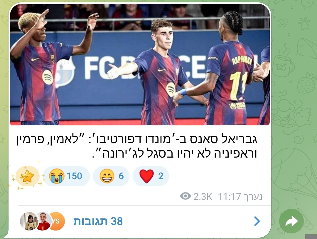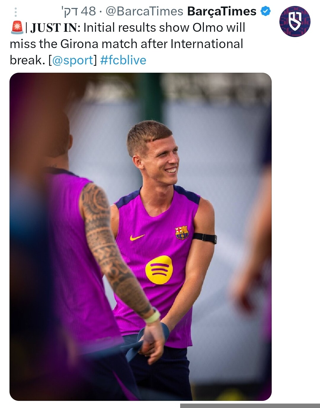 בארסה הודיעה שפראן לא זמין למשחק מחר מתוך זהירות.