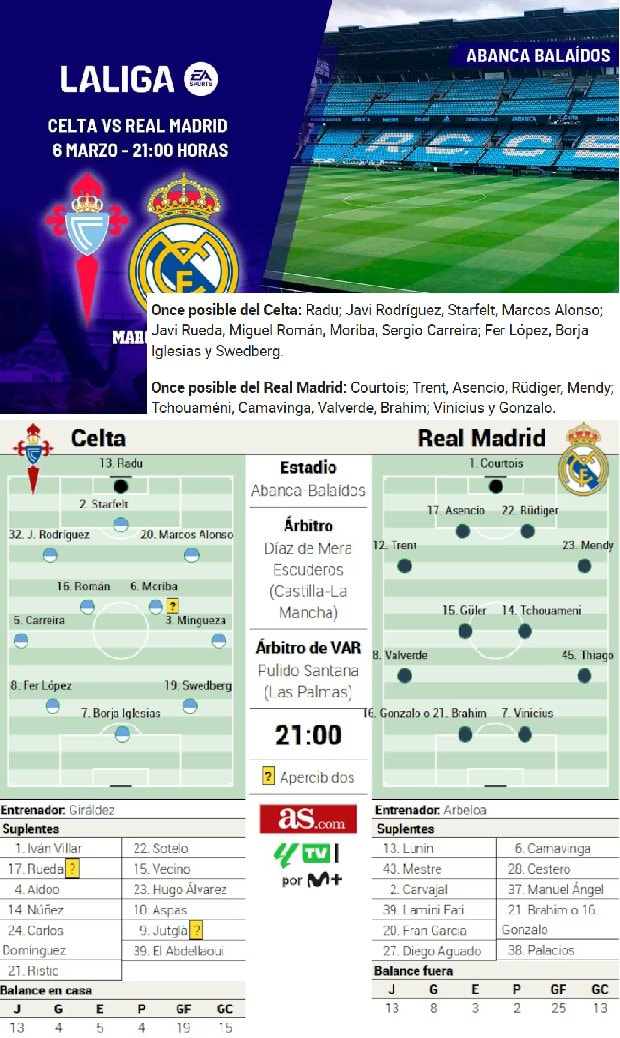 ריאל מדריד מגיעה למשחק בשבר גדול מאוד אחרי שהפרשנים הכריזו שהיא “פרשה מהליגה” עם ההפסד המביך 1:0 לחטאפה בסנטיאגו ברנבאו. הדרך שריאל סימנה הייתה ברורה – ניצחון על חטאפה, אחר כך על סלטה ויגו בבלאידוס (בפעמיים הקודמות בהן ריאל הפסידה לסלטה בבית בשנות ה-2000 היא הצליחה לנקום בבלאידוס ולחכות לאיבוד נקודות של ברצלונה שתשחק מאוחר יותר נגד אתלטיק בילבאו בסאן ממס. התוכנית מן הסתם השתבשה, לפי חוק מרפי – כל מה שהיה יכול להשתבש – השתבש. מנצ’סטר סיטי כבר מעבר לפינה, זה המבחן האחרון, התחושות לא טובות וחודש מרץ עלול לגמור לריאל את העונה. ריאל ללא כדורגל, במרחק ארבע נקודות מהפסגה, המאמן אלבארו ארבלואה חוטף מכל עבר ובצדק (גם המספרים כבר לא לטובתו) וגם אין סגל - אולי שיא נעדרים לעונה. בזמן שאלבארו ארבלואה הציב יעד (לא ריאלי) של לנצח בכל 12 המחזורים שנותרו (מה שקרה רק פעם אחת בשנות ה-2000 – לפני עשור עם זינדין זידאן וגם זה לא הספיק לאליפות) – ריאל חוששת מהפסד ליגה שלישי מה שלא קרה לה מאזן ימי הבלהות עם ז’ולן לופטגי באוקטובר 2018. אז ככה איך ריאל תוכל לשקם ולו מעט מהביטחון העצמי שלה. אולי התאריך הקוסמי מחר – השישה במרץ – היום בו ריאל נוסדה – יעשה את שלו וכל (האין) כוכבים יתחברו ליום הולדת 124 שמח?