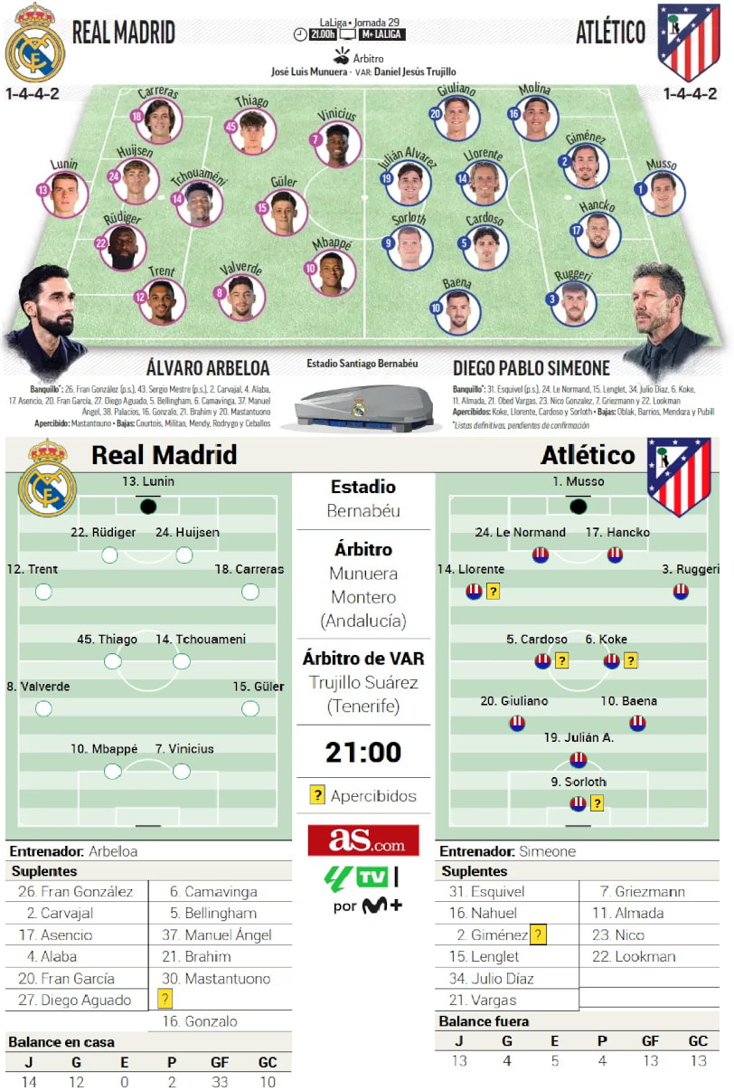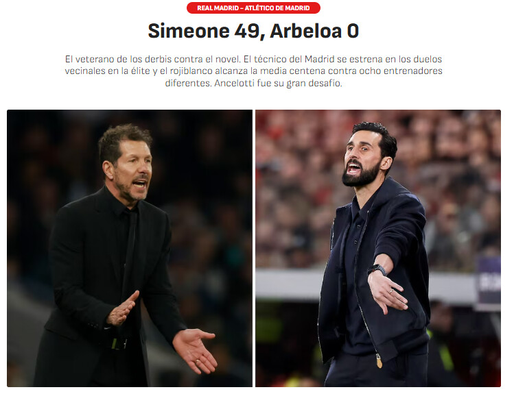 המנוסה מול החדש| הדרבי מחר יהיה קרב בין הוותיק סימאונה שירשום ציון דרך ענק עם דרבי 50 כמאמן נגד ריאל מדריד, לעומת ארבלואה עבורו זה הדרבי הראשון עם כל הכבוד לדרבים כמאמן הקבוצות הצעירות. שמונה מאמנים שונים פגש סימאונה. “הכדורגל הוא זה שיקבע עד כמה הניסיון משמעותי”, נכתב ב-AS. סימאונה פגש את ריאל בכל מפעל אפשרי - בליגה, בצ’מפיונס (ארבעה מפגשים כפולים ושני גמרים), בגביע המלך (כולל בגמר), בסופרקופה הספרדי ובסופר קאפ האירופי. הוא ניצח 14 משחקים, הפסיד 18 ו-17 משחקים הסתיימו בתיקו. סימאונה כמובן היה זה שהחזיר את אתלטיקו לאופנה עם הניצחון בגמר הגביע בסנטיאגו ברנבאו ב-2013, ואחר כך גם קטע את הבצורת הארוכה בת 13 שנה ללא ניצחון ליגה. את קרלו אנצ’לוטי פגש סימאונה 26 פעמים, הוא שיחק 13 פעמים נגד זינדין זידאן וגם פגש את ז’וזה מוריניו ארבע פעמים, את ז’ולן לופטגי לשני משחקים, את צ’אבי אלונסו פעמיים ואת רפא בניטס וסנטיאגו סולארי לדרבי אחד.