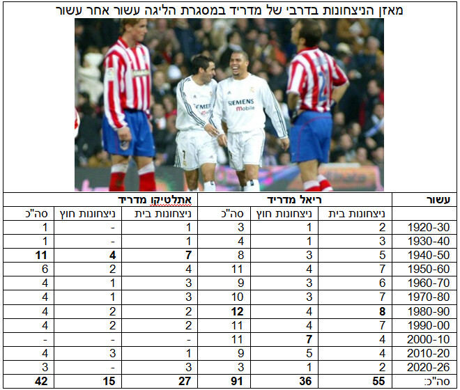 ובכן וכאן יש לנו את הטבלה המלאה בחלוקה לעשורים. העשור הטוב ביותר של ריאל מדריד נגד אתלטיקו היה בשנות ה-80 אז היא השיגה שמונה ניצחונות בבית (מול שני הפסדים) וארבעה ניצחונות בחוץ (הפסידה פעמיים), בסה"כ 12 ניצחונות. בשנות ה-50, בשנות ה-90 ובעשור הראשון של שנות ה-2000 – ריאל השיגה 11 ניצחונות. שנות ה-40 היו העשור הפורה של אתלטיקו עם 11 ניצחונות על ריאל בדרבי, שבעה מהם בבית. העשור הכי גרוע של ריאל מבחינת הפסדים בבית היה אז – ארבעה הפסדים בשנות ה-80.
