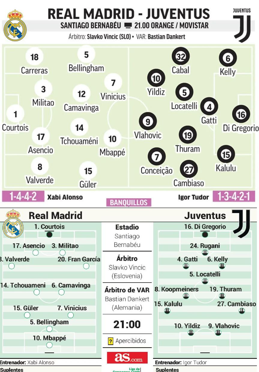 ריאל מדריד מגיעה למשחק נגד יובנטוס אחרי 0:1 קשה מאוד על חטאפה. כעת היא רוצה לנצח גם במשחק השלישי שלה בליגת האלופות בשינוי אווירה לפני המשחק הגדול ביותר, ולהגיע במצב רוח טוב לקלאסיקו נגד ברצלונה ביום ראשון. לא שזה ממש קשור אבל אשתקד ריאל הפסידה כבר ליריבה מאיטליה בסנטיאגו ברנבאו כשנכנעה 3:1 למילאן באחד מרגעי השפל שלה. המשחק נגד יובה הוא עוד אחד מאלה שאפשר לקרוא להם “הקלאסיקו של אירופה” עם זיכרונות רבים ומגוונים, בעיקר אולי טובים. כה אמר בעצמו צ’אבי אלונסו: “זו קלאסיקה אירופאית, גם אני שיחקתי בכמה מהמשחקים הרבים. אנחנו מרגישים מאוד מוכנים וצריכים את הקהל והאצטדיון שלנו. אוהדים באים לסנטיאגו ברנבאו להוטים כדי לראות משחקים גדולים – ואנחנו חייבים לתת להם משהו כדי שהם יגיבו ויהיו איתנו”. אלונסו אפילו נשאל על גמר ליגת האלופות 2017 (באותה עונה היה שחקן באיירן מינכן ופרש) ואמר: "יש לי הרבה כבוד לזינדין זידאן. אני זוכר היטב את המשחק הזה, ניצחון גדול של ריאל מדריד ששלטה במשחק מההתחלה ועד הסוף, הם השיגו ניצחון מבריק.