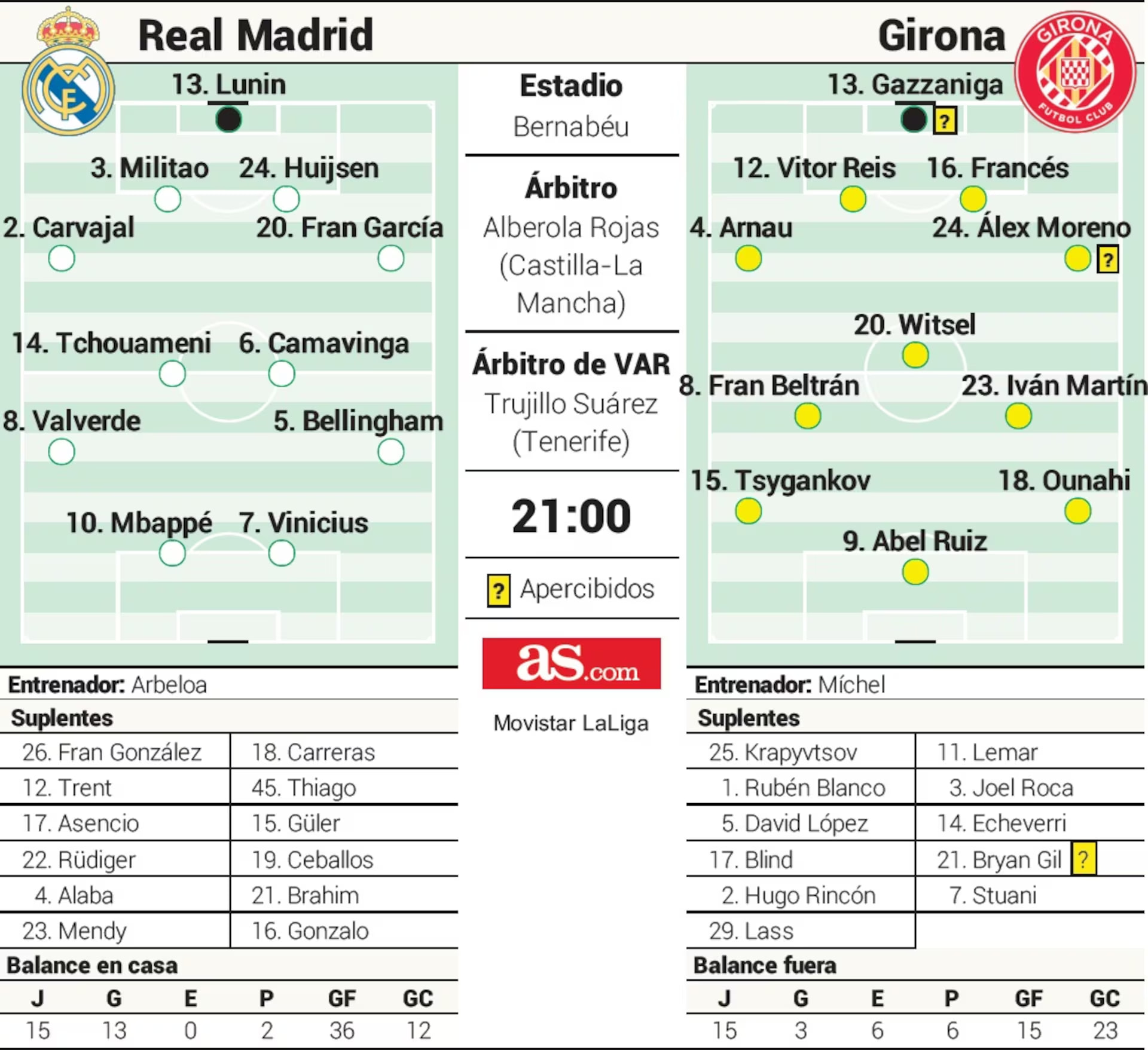 ריאל מדריד מגיעה למשחק נגד ג’ירונה אחרי שבוע מסויט בו כמעט סיימה את העונה (אותה ג’ירונה כבר הייתה חלק מרצף שלילי של ריאל בסיבוב הראשון בליגה). לאחר ההפסד 2:1 למאיורקה בחוץ שהגדיל את הפער בצמרת, הגיע הפסד נוסף של 2:1 – לבאיירן מינכן ברבע גמר ליגת האלופות. כעת נראה שריאל מדריד רוצה רק לחזור לנצח, להחזיר קצת מהביטחון ולתת נתח משמעותי יותר של דקות לג’וד בלינגהאם ואדר מיליטאו שעלו מספסל בשלישי והקבוצה בונה עליהם כשחקנים חשובים בתקווה לעשות את הכמעט בלתי אפשרי נגד באיירן מינכן. המאמן אלבארו ארבלואה כבר אישר שהם ייפתחו בהרכב. ארבלואה, שאגב יציין את משחקו ה-20 על הקווים (13 ניצחונות מול שישה הפסדים), כבר הפסיד יותר משחקים מאשר צ’אבי אלונסו העונה ובפחות זמן. בליגה ניצחה ריאל 13 מ-15 משחקי הבית שלה והיא קבוצת הבית השלישית בטיבה אחרי ברצלונה (15/15) ואתלטיקו מדריד (40 נקודות מ-48 משחקים)