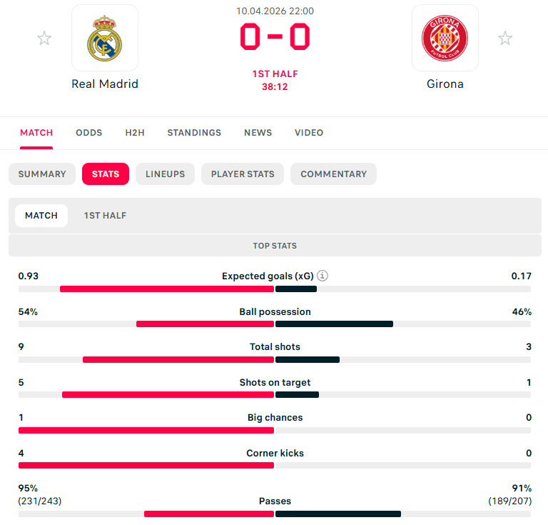 בעונת 2017-18 בסיבוב השני ריאל ניצחה 3:6 אחרי 1:1 בהפסקה כשכריסטיאנו רונאלדו משתולל עם רביעייה וגם לוקאס ואסקס וגארת’ בייל הבקיעו. בצד של היריבה - צמד לכריסטיאן סטואני. כעבור עונה ג’ירונה חוללה סנסצייה על הפרצוף של סנטיאגו סולארי וניצחה 1:2, יש לכם ספק מי הבקיעו? במשחק הנוסף, ב-2022-23, ריאל סיימה בתיקו 1:1 כשוויניסיוס כובש ראשון, סטואני משווה, טוני קרוס הורחק בצהוב שני בתוספת הזמן והיו הרבה כעסים ועניינים מול השופט. במבט על כל משחקי הליגה - 11 במספר, הנתונים די מאוזנים, ריאל ניצחה שש פעמים וג’ירונה שלוש. העונה במחזור ה-14 זה נגמר בתיקו 1:1, היה זה תיקו שלישי ברציפות של ריאל של צ’אבי אלונסו. אמבפה השווה בפנדל בדקה ה-67, עז א-דין אונאחי כבש ראשון ליריבה. עוד נספר שנערך גם מפגש כפול בגביע המלך ב-20218-19, שמשפר קצת את המאזן של ריאל, שניצחה 2:4 במשחק הראשון בברנבאו עם צמד של ראמוס, ו-1:3 בגומלין בחוץ, כאשר אז קארים כבש צמד ומרקוס יורנטה גם הבקיע.