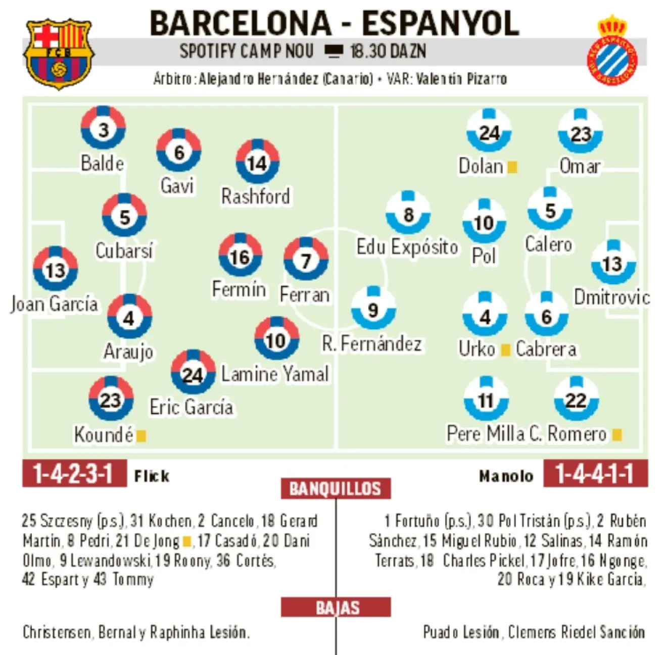 לאמין, פדרי, אולמו , קאנסלו, ראשפורד לא צריכים לשחק.