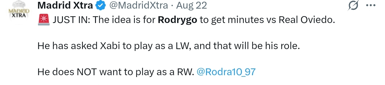 אין דבר כזה “רודריגו הודיע שהוא לא חוזר לעמדה בצד ימין”. אתה רוצה להגיד לי שאתמול אם צ’אבי אלונסו מקים אותו בדקה ה-70 להיכנס לעמדה אז הוא היה אומר לו ‘עזוב אותך’ וחוזר לספסל? ממש לא. אם יהיה צורך, רודריגו ישחק בצד ימין. זה שיקול של המאמן ומה שכן קרה סביר להניח - אלונסו ישתמש בו הרבה-הרבה יותר בצד שמאל, גם כי ויניסיוס בניגוד לליטוף של קרלו אנצ’לוטי - כבר לא שחקן שאי אפשר לגעת בו.
