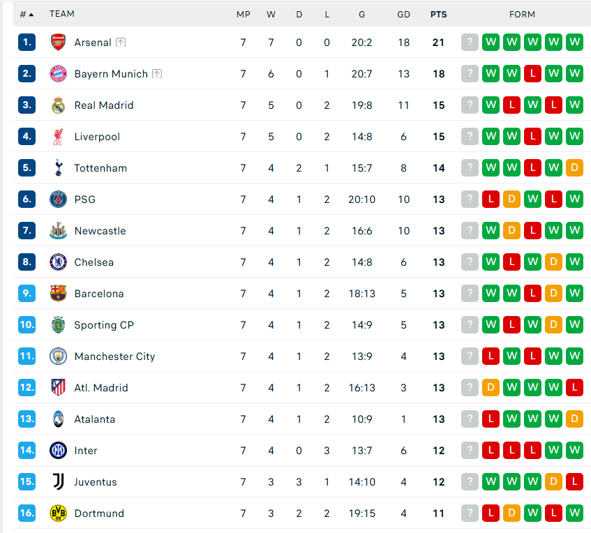 כל המשחקים הרלוונטים: בנפיקה ליסבון (29) - ריאל מדריד (3) | ליברפול (4) - קרבאח (18)| איינטרכט פרנקפורט (33) - טוטנהאם (5)| פריז סן ז’רמן (6) - ניוקאסל (7)| נאפולי (25) - צ’לסי (8)| ברצלונה (9) - פ.צ קופנהאגן (26) | אתלטיק בילבאו (23) - ספורטינג ליסבון (10)| מנצ’סטר סיטי (11) - גלאטאסראיי (17)| - אתלטיקו מדריד (12) - בודו גילמט (28)| אטאלנטה (13) - יוניון סנט גיל (31)| בורוסיה דורטמונד (16) - אינטר (14)| מונאקו (21) - יובנטוס (15)