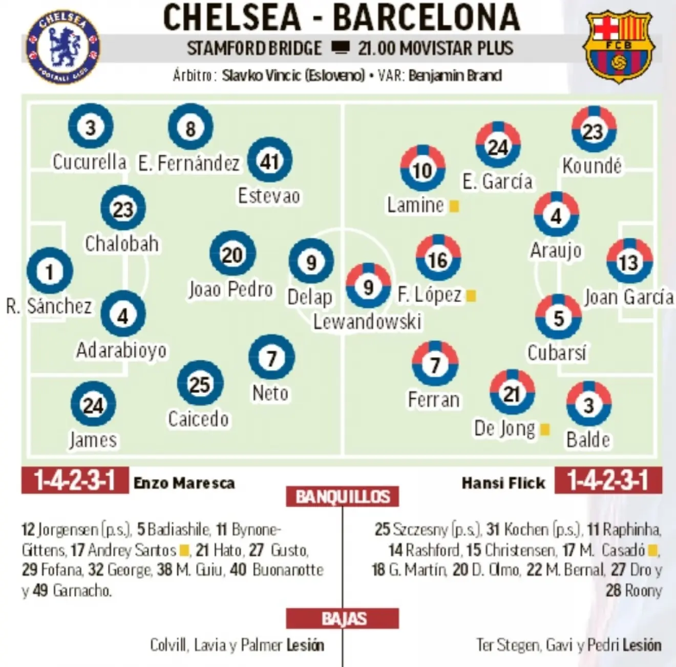 כריסטנסן יחזור אל הבית הקודם שלו (התא הכי ימני, זה שעל הדלת שלו מודבק דף שכתוב עליו “משלשלים”), אבל ככל הנראה יפתח בספסל. מי שיעלו בהרכב הם קובארסי, קונדה ובאלדה, כשכרגיל הבחירה לגביי זהות הבלם הנוסף תהיה בין רונאלד “פור פאק סייק” אראוחו, לבין אריק “המסיכה” גרסיה. בקישור, עקב חזרתו של ההולנדי, וכושרו הנוכחי של אאא"פ, לפליק תהיה התלבטות בין אסאדו ההגנתי לבין אולמו האפסי. בהתקפה, לראשונה מזה הרבה הרבה זמן, יעמוד לרשות פליק כל הקאדר (אם כי ראפיניה לא יפתח, כנראה), מה שיצור עניין לגביי הבחירות של הגרמני בהרכב.