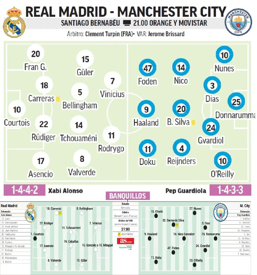 את הקשר המצוין טייאני ריינדרס שהגיע ממילאן והשתלב נהדר במרכז השדה, וגם שפיל פודן יצא מהדיכאון (המקצועי) שלו זו התחושה וחזר להבקיע לאחרונה. בעוד ז’רמין דוקו בעיקר מכדרר ומייצר מצבים, פודן עם תשעה כיבושים. בכל העונה שעברה המאכזבת היו לו רק 13, כך שאלו חדשות טובות. שניהם, גם ריינדרס ההולנדי וגם פודן, קבלו מנוחה מסוימת במשחק האחרון. אחרי השער השלישי לפני הדקה ה-70 הוריד פפ את הולאנד (מארמוש נכנס במקומו), את פודן (ריינדרס שפתח על הספסל עלה במקומו) וגם יושקו גברדיול. במשחק נגד לברקוזן ביצע פפ רוטציות רבות - התחכם כמו שהוא אוהב ושילם ביוקר, אבל מאז כמעט ולא. הקבוצה מגיעה למשחק לא רק במומנטום טוב אלא גם עם סגל כמעט מלא למען האמת. האקס מתיאו קובאצ’יץ’ ייעדר בשל פציעה וגם רודרי איננו כמובן (415 דקות בלבד העונה), לא הצליח לחזור מהפציעה האכזרית ההיא. ברנרדו התייחס לכך וכשנשאל מה שונה בקבוצה שלו ביחס למפגש נגד ריאל אשתקד, אמר: “אמנם זה לא תירוץ להופעה שלנו – אבל הפציעות הביאו להשפעה עצומה ופגעו בנו”. ברנרדו שמתקרב לטופ עשרת שיאני ההופעות במועדון, רוצה בוודאי לשפר את יכולתו מהעונה שעברה, והוא הרבה לזרוח נגד ריאל מדריד כפי שיעיד על כך הצמד שלו באיתיחאד ב-2023.