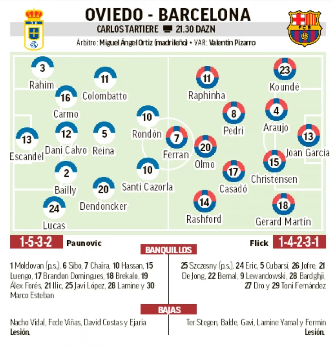 לעיניין, אין לי ציפיות מול אוביידו. למרות שמדובר על משחק בית, וכנראה יגיעו עם התלהבות שיא מול בארסה, ועדיין. קבוצת ליגה שנייה שעד כה מקבלת בראש שצריכה להתמודד עם משחק מול בארסה באמצע שבוע. השאלה היא מה פליק יחליט. או שנראה מראש רוטציות והשמשה של שחקנים שלא מקבלים הרבה דקות כמו קסאדו ואראוחו שצפויים לפתוח לפי רוב ההערכות, אולי אפילו נראה עוד שחקנים שצריכים לעבור השמשה כמו ג’ופרה ורוני. הכל תלוי איך פליק ירצה לגשת למשחק.