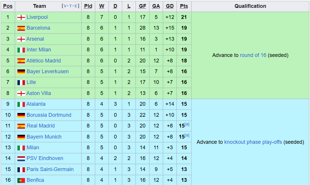 אתמול כצפוי: ליברפול עם 0:3 על מארסיי משתווה אלינו עם 15 נקודות| ברצלונה עם 2:4 על סלאביה פראג קפצה למקום התשיעי| באיירן מינכן עם 0:2 על יוניון סנט גיל העפילה לשלב הבא, אחרי שהורידה אותנו למקום השלישי. חמש קבוצות עם 13 נקודות. לריאל מדריד יש פור של חמישה שערים בהפרש על ליברפול וזה אמור להיות קריטי, יחד עם משחק בין מקומות 6-7.