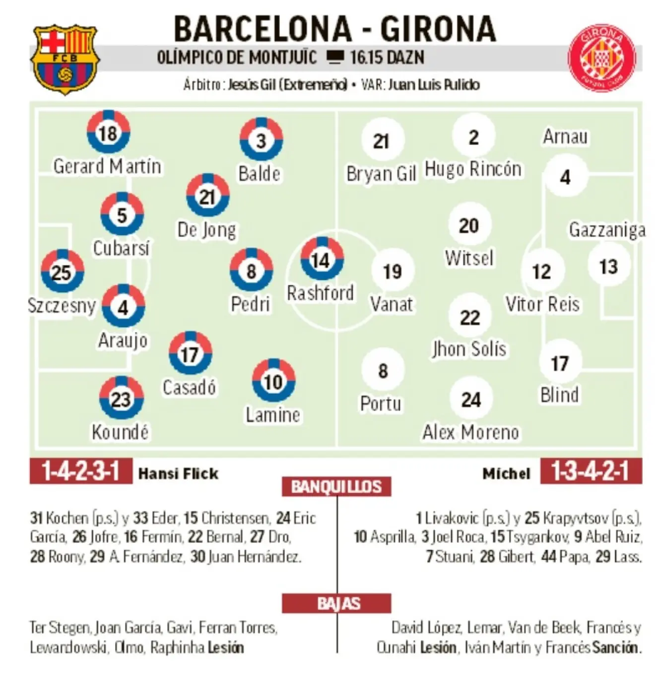בצד האדום-לבן של המפגש, ג’ירונה סוף סוף ניצחה במחזור האחרון (2:1 ביתי על ולנסיה), וצברה 5/9 ב-3 המשחקים האחרונים (בזכות תוצאות תיקו מול אספניול ובילבאו). אבל 5 הנקודות האלו הצטרפו לבסה”כ 1 נוספת ב-5 המחזורים שלפני כן, מה שמעמיד מחממי האסלה של סטואני במקום ה-18, עם יחס שערים מזמין שער בכורה של בארדג’י (או איך שפליק קורא לו: “אתה שם, כן…זה שאני מצביע עליו”) של 5:17. כלומר, אם יש משחק בו ברצלונה יכולה למלא בו גיגית ואז להיכנס בה עם שופל - זה זה.