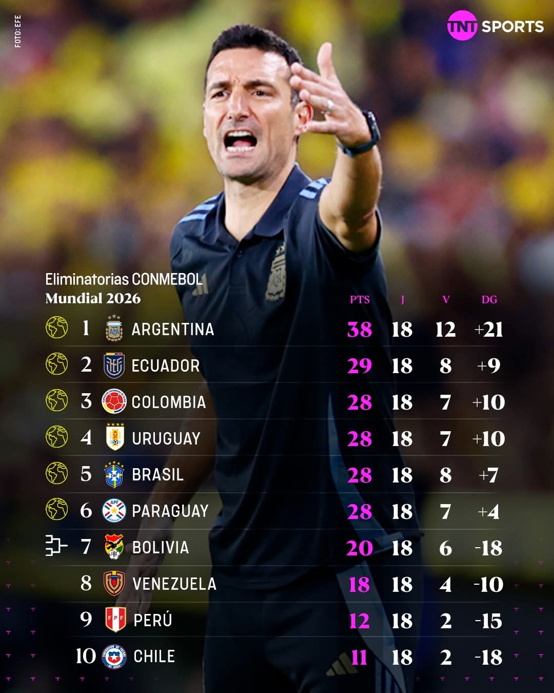 כך נראת הטבלה הסופית של מוקדמות המונדיאל בדרום אמריקה, ארגנטינה במקום הראוי לה, ראשונה כאלופת עולם ![]()