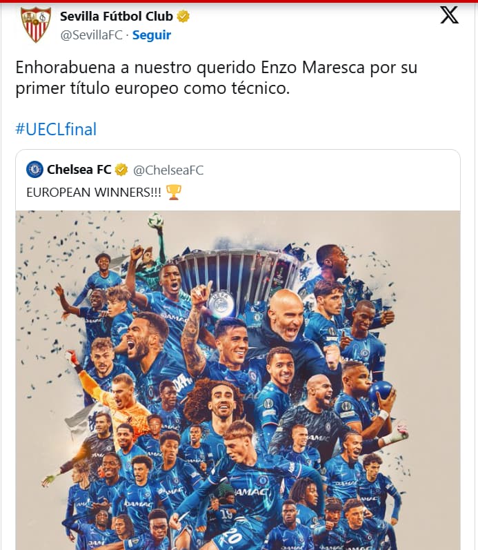 לאחר המשחק סביליה היריבה הגדולה מעבר לכביש בירכה את צ’לסי ומאמנה אנסו מארסקה - קשר עבר נפלא של המועדון, על הזכייה, בטוויטר, ובבטיס זעמו. הנשיא אנסו הרו "לא ראיתי את זה, אבל הם כרגע במלחמה אחרת שלא מעניינת אותי . אנחנו מתמקדים בצמיחה, בהצלחה בשנה הבאה, והם במלחמה שונה מאוד משלנו.