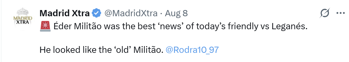 ייתכן שאדר מיליטאו לא גמור כמו שהערכנו? בסוף העונה הקודמת עלו דיווחים שהוא חזר בצורה מעולה שהתייחסתי אליהם בביטול. גם שנה לפני כן בפציעה הקודמת אחרו שהוא חזר טוב, כשהוא היה אסון מהלך. הוא עלה לעשרים דקות מצוינות באופן מפתיע מול פסז, והדיווחים אומרים שהוא מראה יכולת גבוהה בינתיים באימונים ושצ’אבי אלונסו בונה עליו. אני עדיין לא בונה על זה הרים וגבעות, אבל דיווח מעניין.