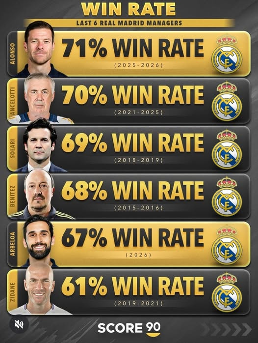 המספרים אומרים: צ’אבי אלונסו המאמן עם אחוז הניצחונות הכי גבוה בריאל מדריד מאז זינדין זידאן בפרק א’. אלונסו ניצח 24 מ-34 משחקיו (סה"כ המאזן הוא 24-4-6) - 70.6% (עיגלו כאן ל-71%). ב-Score90 הציגו את הדירוג, הספרדי מעל קרלו אנצ’לוטי. והמאמן הנוכחי…