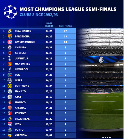 ריאל מדריד הייתה ברבע הגמר 21 פעמים, העפילה מתוכן 17 פעמים לחצי הגמר, האחרונה ב-2023/24 אז עברה את מנצ’סטר סיטי בפנדלים. ברצלונה במקום השני יחד עם באיירן מינכן עם 13 העפלות כאשר הקטלונים היו שם בעונה שעברה ובאיירן בדומה אלינו - לא. אחר כך מדורגת צ’לסי במקום הרביעי. מילאן-יובנטוס-מנצ’סטר יונייטד חולקות יחד את המקום החמישי עם שבע העפלות. האנגלים לא היו ברבע הגמר מאז 2010-11, כבר 15 שנה. לליברפול שש העפלות לחצי הגמר - האחרונה ב-2021-22, לפריז סן ז’רמן חמש העפלות [אלופת אירופה המכהנת]. אינטר, בורוסיה דורטמונד, מנצ’סטר סיטי, אייאקס ומונאקו אחריהן עם ארבע העפלות. אתלטיקו מדריד וארסנל שלא זכו מעולם במפעל בינתיים עם שוש העפלות. ולנסיה (בשני המקרים העפילה לגמר), ויאריאל, ליון ופורטו עם שתי העפלות