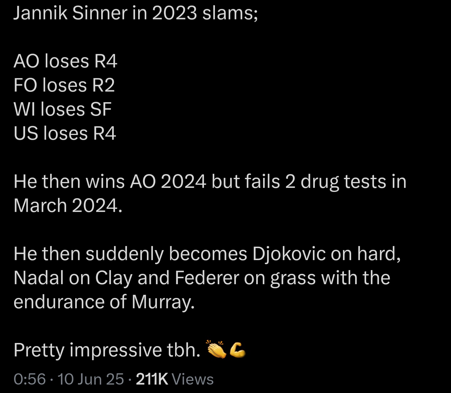 בסרטון נאמר שנדאל בטוח שהכל כשר במקרה סינר, למרות שלפני 9 שנים אמר על שארפובה שגם רשלנות חמורה באותה מידה (ואין שום רשלנות במקרה סינר כי?).