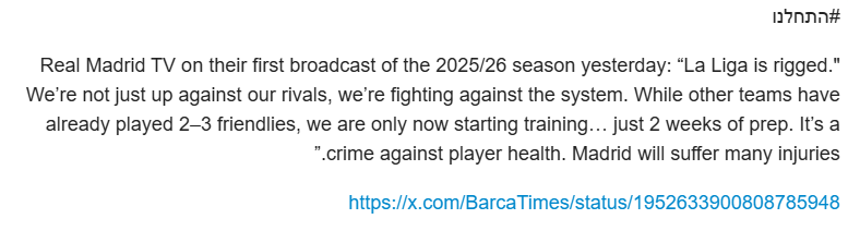 עדיין לא הבנתי אותך עד הסוף לגבי ריאל מדריד אבל קח בחשבון שדויד אלאבה כבר בן 33 וזה לא ממש קרוב לאנסו פאטי ילד צעיר אהוב הקהל שאולי כן יהיה אפשר למכור אותו בכמה לירות אחרי עונה טובה, וכנ"ל סמואל אומטיטי או קלמון לנגלה (אם כבר העלת את שמו אז מעולם לא הבנתי איך שחקן ברמה הזו הגיע לברצלונה). נסכים שלא להסכים ותודה על השפה היפה שהגבת כלפיי גם אם אנחנו לא מחזיקים באותן הדעות.