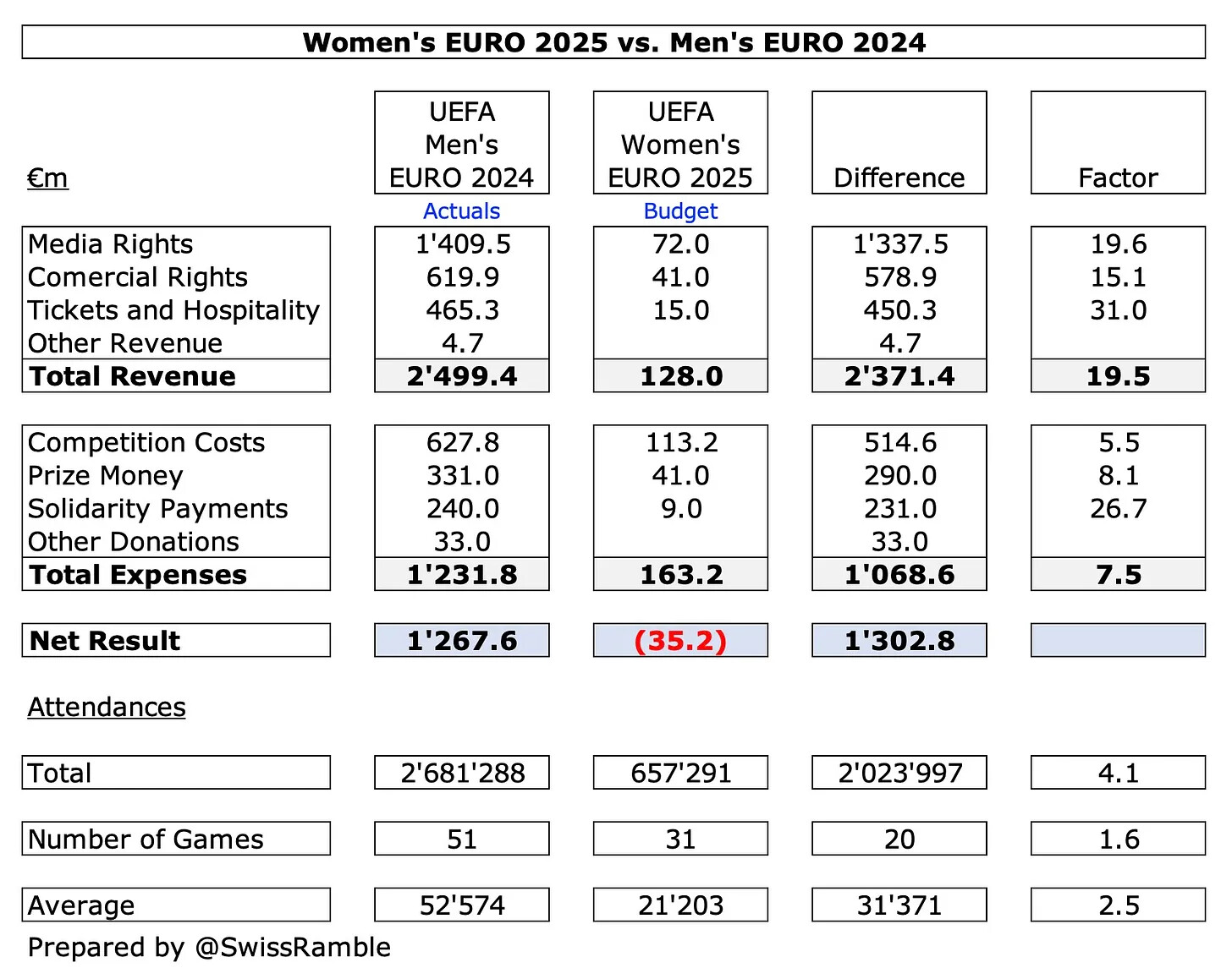 השוואה בין אליפות אירופה 2024 לגברים לבין אליפות אירופה 2025 לנשים, מבחינה פיננסית.