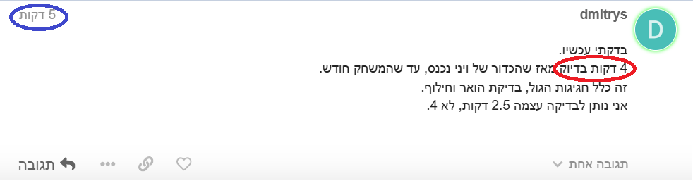 הבדיקה עצמה לא ארכה 4 דקות, הם לא מתחילים על השניה והיה גם חילוף אחרי שהבדיקה הסתיימה.