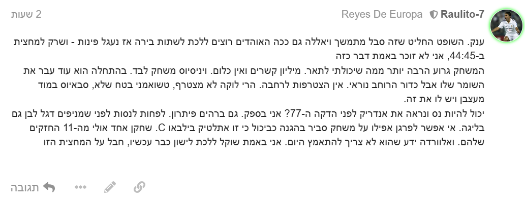 זה לא שריאל מדריד שיחקה בשכל והייתה רגועה ‘יש לנו עוד כמה דקות’, מבטי הייאוש היו, זה היה משהו מאולתר, פוקס. הלחץ היה בשיאו. זה משחק שבהחלט שווה חמש דקות תוספת זמן לאור בדיקת ה-VAR, לא היו גולים אבל חילופים כן - ארבעה שלנו (אנדריק, ברהים וגולר, לוקאס) וחמישה שלהם (בין היתר נכנסו אויחאן סאנסט ואינייאקי וויליאמס). לא בדקתי כמה פעימות היו - שלוש מהצד שלנו. לא משנה