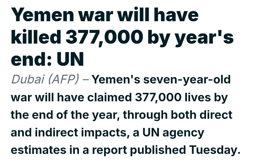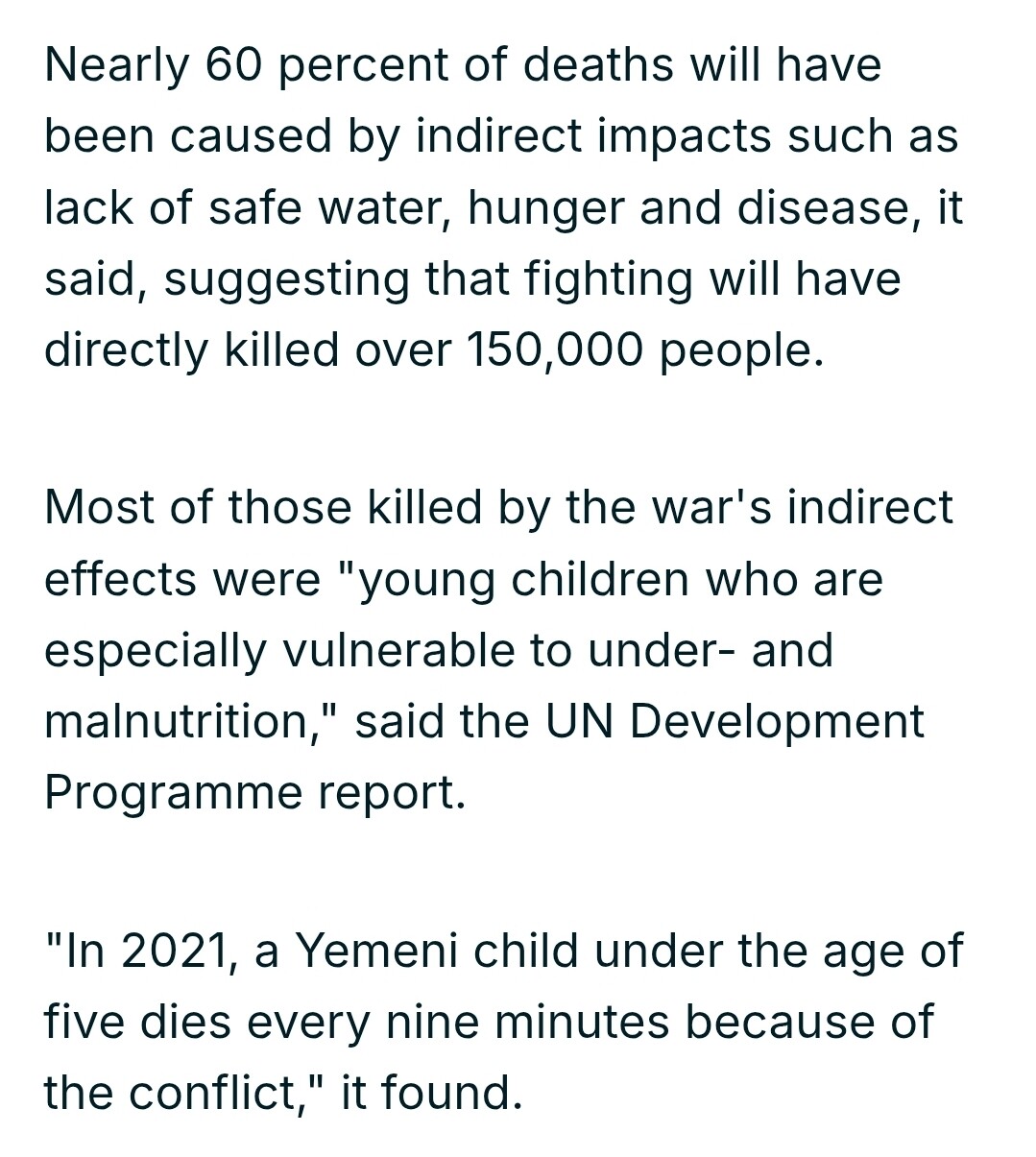 שימו לב גם לתיאום המושלם והמצמרר בין מועד חתימת הסכם הסחר העצום הזה, בין סעודיה לבין האיחוד האירופי - 2021 - לבין הנתון המפורסם בדו"ח האו"ם לעיל, לפיו בשנת 2021 נהרג ילד תימני בן פחות מ-5 כל 9 דקות (בעיקר כתוצאה מרעב שסעודיה כפתה על האוכלוסיה המקומית - אוכלוסיה באמת לא מעורבת, שמעולם לא בחרה ולא רצתה בחות’ים).