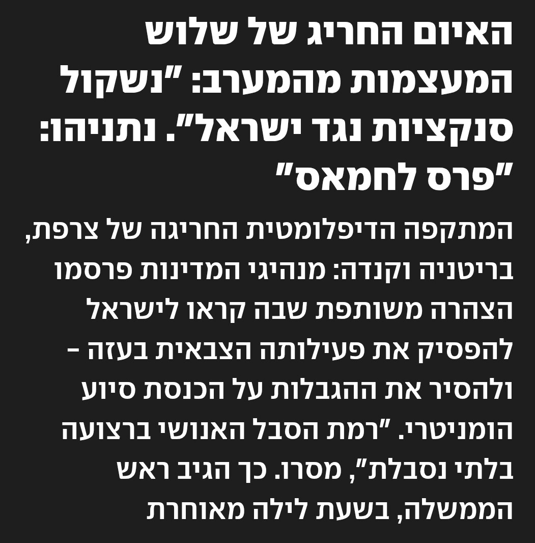 (*) שלא לדבר על הצביעות האינהרנטית שיש בידיעה הראשונה שהבאתי, איך ביד אחת הם קוראים להטיל סנקציות על ישראל, בעוד ביד השנייה הם מסירים בקלילות את הסנקציות מעל גורמים שעד לפני שנייה וחצי הוגדר (בצדק) כארגון טרור ע"י כל העולם, כשהדם עוד לא הספיק להתייבש להם על הידיים.