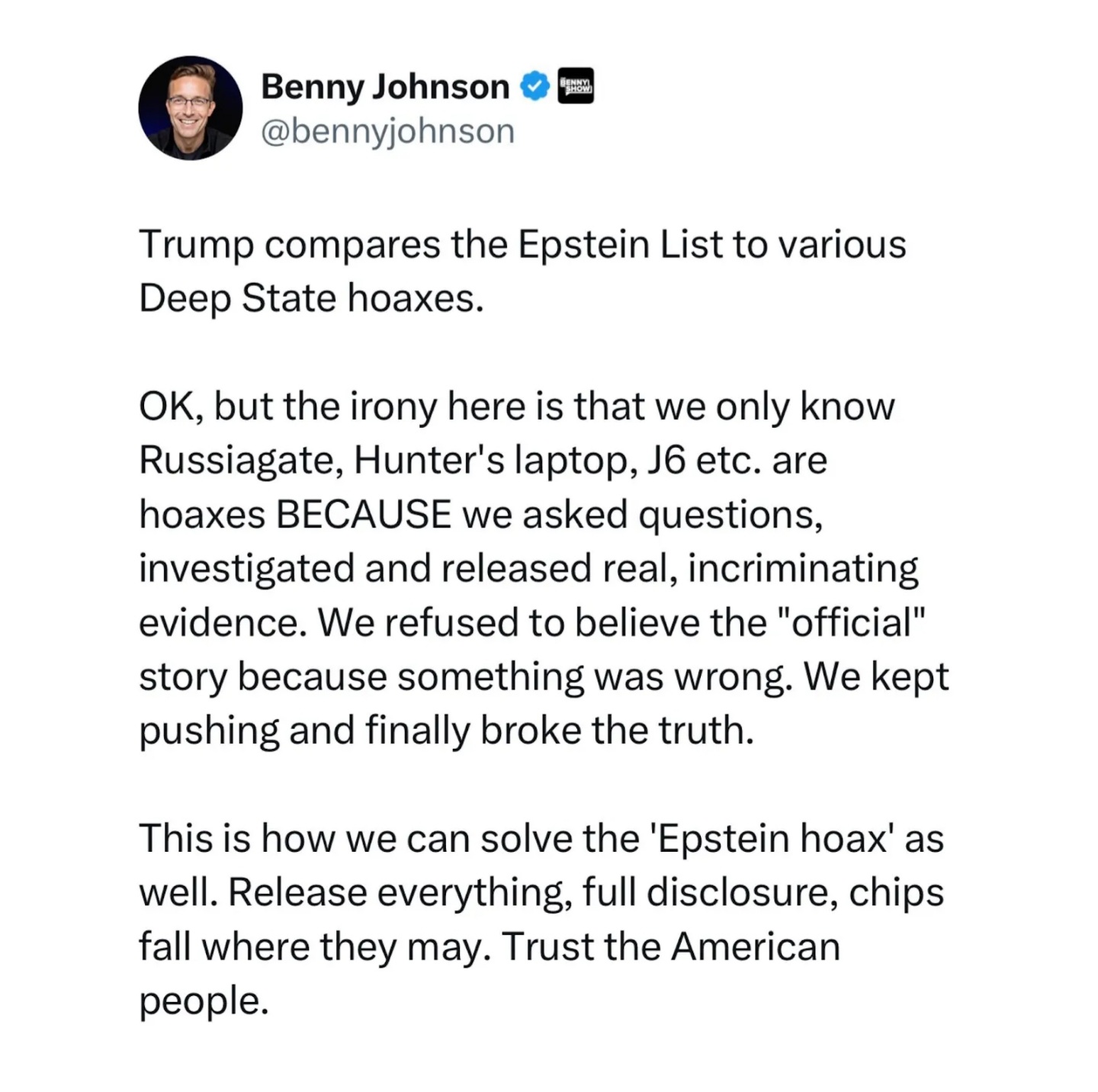 אני כמובן לא מכחיש שאפשטיין היה מקושר ובסבירות גבוהה שיחד ו/או סחט אנשים בכירים עם קטינות וכו׳, רק מטיל ספק שקיימת איזה רשימה או רשימות עם מלא שמות שהמשטר מפחד לפרסם.