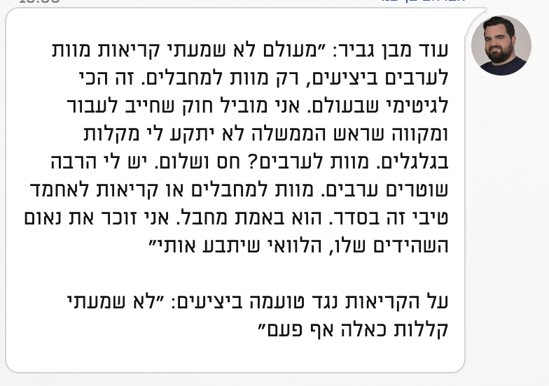 וכמובן, לגמרי מחזק את הגיחוך בלשמוע את הצד השני מזדעזע מכך שבן גביר שר תוך התעלמות מוחלטת מכך שהוא אשם בזה.