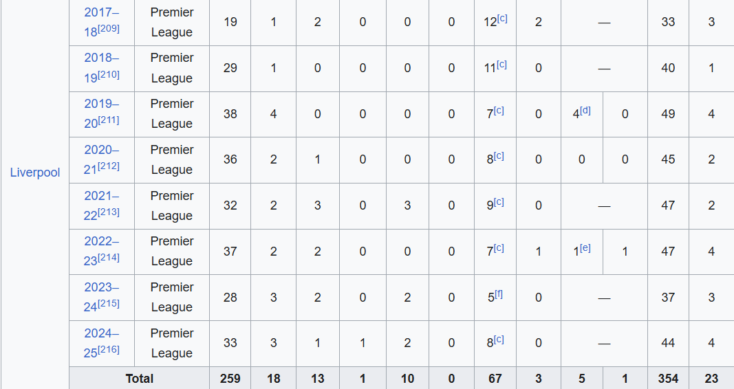הורדתי את עונת הבכורה שלו בקבוצה הבוגרת בה עוד היה שחקן צעיר ושיחק בעיקר בנוער. 354 משחקים בשמונה עונות, 44 הופעות בממוצע לעונה.