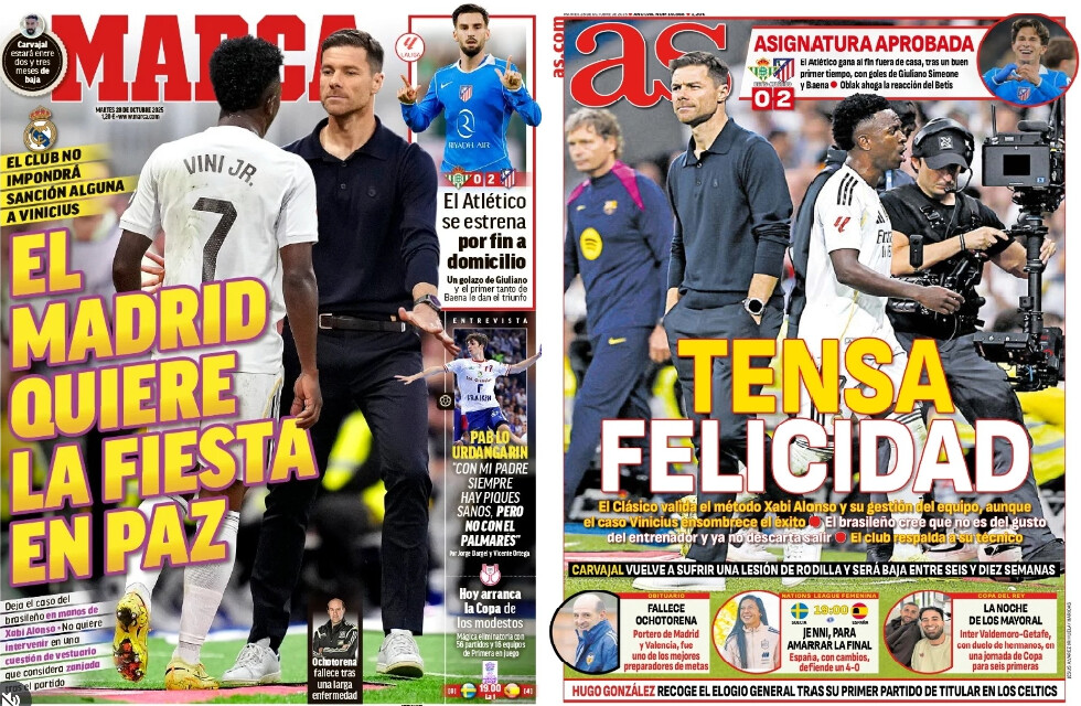 כותרות העיתונים| מארקה: “ריאל מדריד רוצה להעביר את ‘המסיבה’ בשלום”| שער ה-AS: “אושר מתוח” - הקלאסיקו היה רגע השיא של ריאל החדשה אבל המצב עם ויניסיוס מעיב על האווירה".