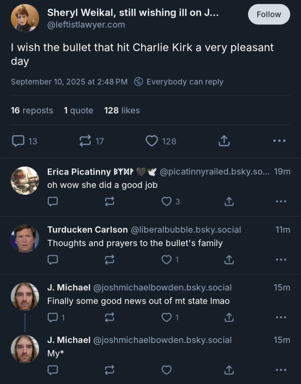 מימיי לא חשבתי שהשמאל האמריקאי יהפוך לאלים יותר מהימין, על אף כל הביקורת העצומה שיש לי עליו. אבל אנחנו שם. ניסיונות ההתנקשות בטראמפ, מנג׳יוני, ועכשיו קירק שרשמית נרצח, והוא צעיר ממני… זמנים רעים.