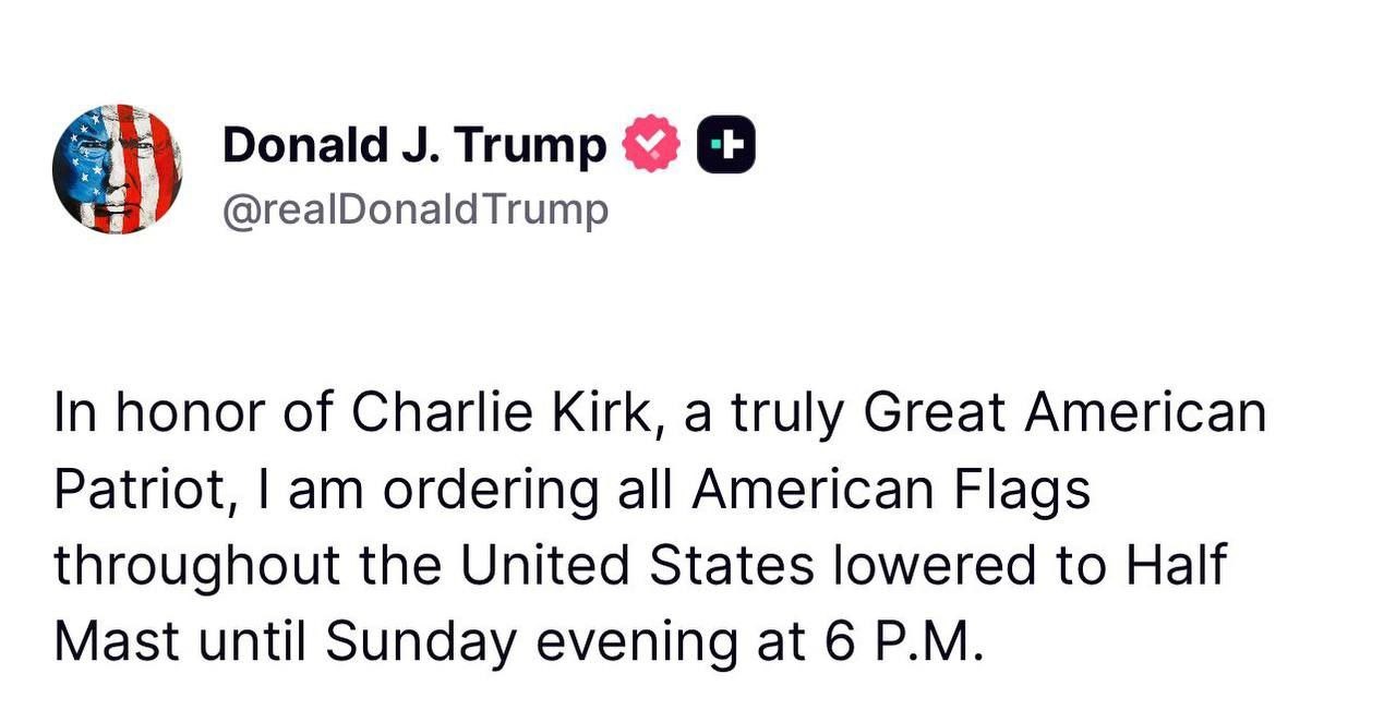 לכבודו של צ’רלי קירק, פטריוט אמריקאי גדול באמת, אני מורה על הורדת כל דגלי ארצות הברית לחצי התורן עד יום ראשון בערב בשעה 18:00.