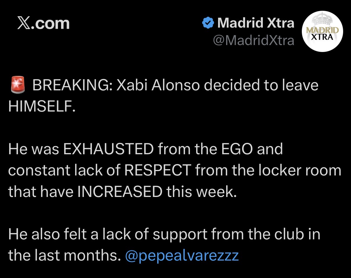 צ’אבי אלונסו התפטר-פוטר| התפטר או פוטר? זה באמת משנה? נניח לא רצה להישאר כי הרגיש שהוא בובה על חוט… חשבתי שההפסד שלנו אתמול יתיש אותי, האין-כדורגל, מה שקרה אחר כך, ואז זה הגיע, בוקס. במועדון הזה אין רגע דל יא אלוהים אני לא ממש אופתע אם זו לא באמת החלטה הדדית. אני שמח שזה אלבארו ארבלואה המחליף ולא סנטיאגו סולארי, אבל אם לא ספרו את צ’אבי אלונסו שממש חבל לי עליו - אז מי זה עבורם מאמן קסטיליה גם הוא נחשב לדיקטטור עאלק. זה שזה עבד עם זינדין זידאן כשהיה לנו סגל של ווינרים וזיזו אחד השחקנים הגדולים בהיסטוריה - זה לא אומר כלום.