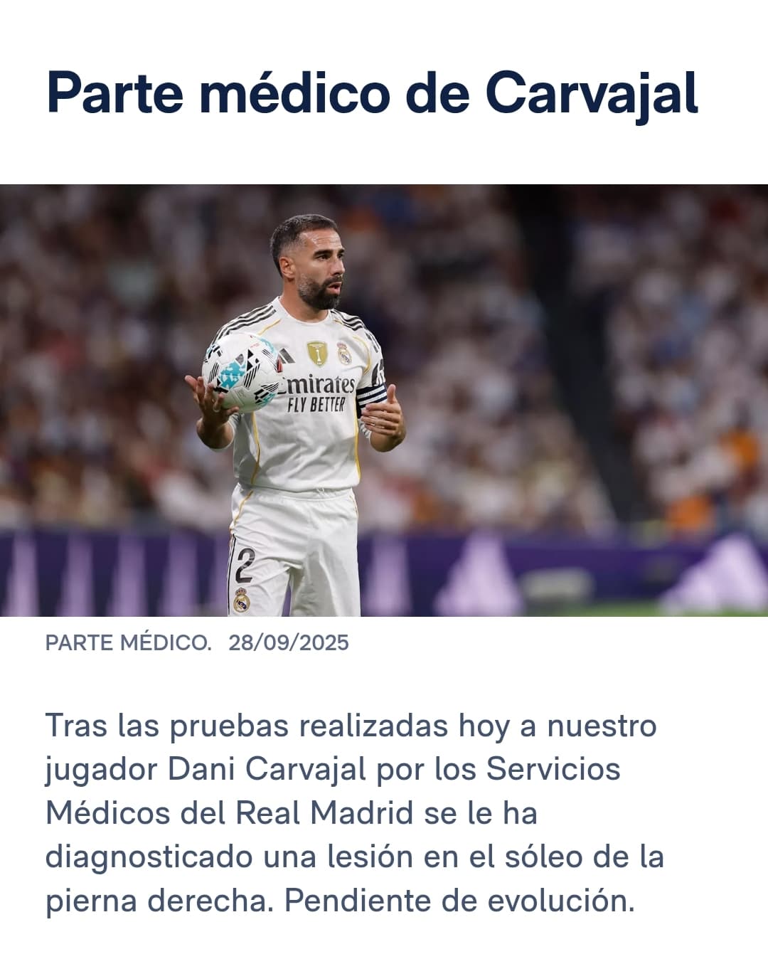 אין מגן ימני. איפה לוקאס ואסקס? דני קרבחאל שהוחלף אתמול בדרבי סובל מפציעה בסולאוס וייעדר כארבעה שבועות. על הגבול ממש לגבי הקלאסיקו ב-26 באוקטובר, יחמיץ כמובן את קייראט ו-ויאריאל ואת משחקי הנבחרת - וגם את יובנטוס. פציעה ראשונה למגן מאז הקאמבק למגרשים.