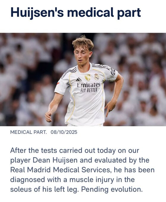 דין האוסן נופה ממש עכשיו מסגל נבחרת ספרד בשל בעיות שרירים (נכתב כי הצטרף למחנה עם תסמונת של עייפות ובעיות שרירים). אתמול הוא לא הצליח להתאמן, ריאל מדריד קיבלה עדכון. הערכה ראשונית: פציעה שדורשת מנוחה בין שבוע לשבועיים, והדיווח הוא שרופאי המועדון אישרו זאת. הוא יחמיץ את חטאפה, יהיה בספק למשחק באמצע השבוע בליגת האלופות נגד יובנטוס וככל הנראה לא ישותף גם אם יחזור בזמן, אבל יגיע לקלאסיקו ב-26 לחודש.