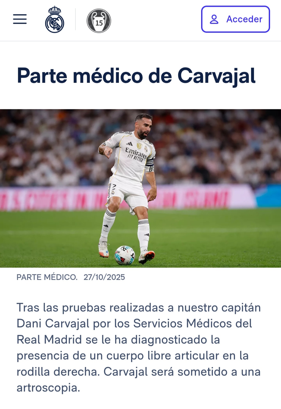הקפטן רק חזר ושוב מושבת. דני קרבחאל נפצע, נבדק ואף יעבור ניתוח קל בבירכו! עלה הדו"ח באתר הרשמי - סובל מפגיעה בברך ימין. עד לפגרה ריאל מדריד פוגשת את ולנסיה בשבת, ליברפול ברביעי ואז ראיו וייקאנו אבל נראה שזה הרבה יותר מזה. הדיווח הראשוני שעלה גם במארקה הוא על חודשיים-שלושה בחוץ - מזעזע!