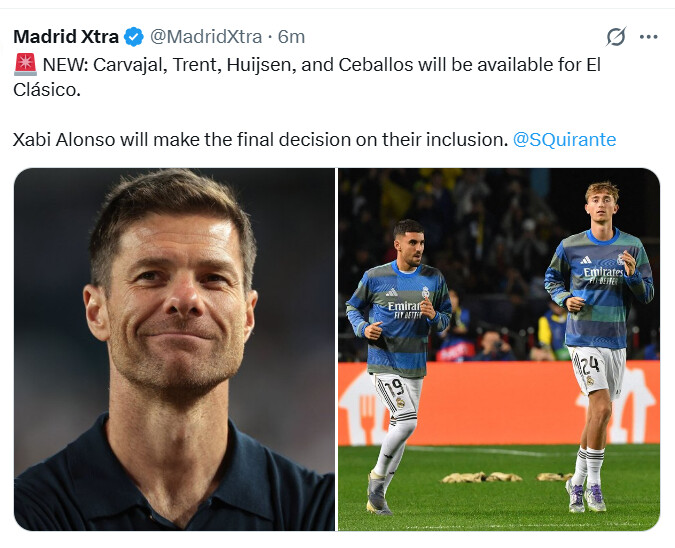 ממש מעכשיו - לפי סרחיו קירנטה כתב DAZN - כמעט כל הפצועים יהיו זמינים לקלאסיקו. טרנט אלכסנדר-ארנולד שהיה במצב המתקדם ביותר וכמעט נכלל בסגל נגד יובנטוס, דני קרבחאל, דין האוסן (אתמול נשאל על ידי כתב של אל צ’ירינגיטו ואמר: “אני יודע אם אגיע בזמן לקלאסיקו ואחזור מהפציעה אבל אתם תחכו ותראו…)” וכן דני סבאיוס שגם הוא נעדר מצמד המשחקים האחרונים. האוסן לא השלים אף אימון מאז הפציעה ועזיבת הכינוס של הנבחרת.